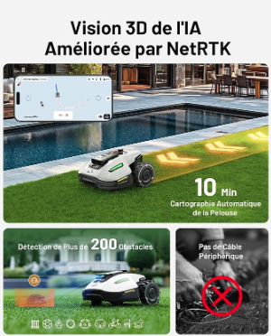 Module de vision IA UltraSense de pointe : Lorsque le sol et les bords de la pelouse sont alignés, YUKA mini robot tondeuse peut se déplacer le long de la limite pour une coupe nette et précise. Détectez les limites invisibles pour rester dans les zones de tonte désignées, même sans signaux satellites. Reconnaissance et évitement d'objets IA La technologie de reconnaissance et d'évitement d'objets 3D par apprentissage profond IA de YUKA mini excelle dans la détection et l'évitement des obstacles.